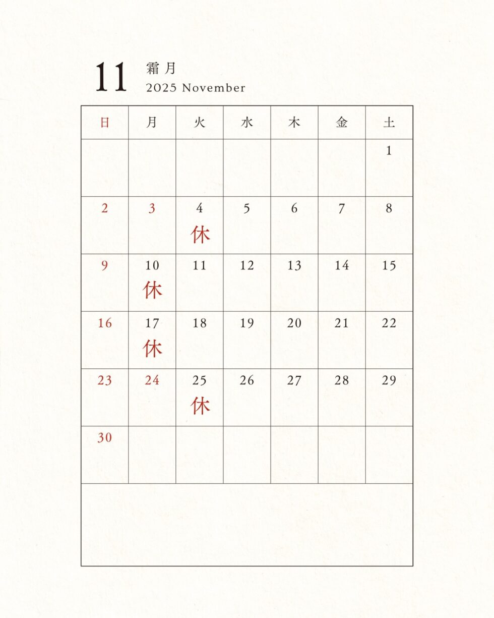 令和7年 11月4日(火)、10日(月)、17日(月)、25日(火)