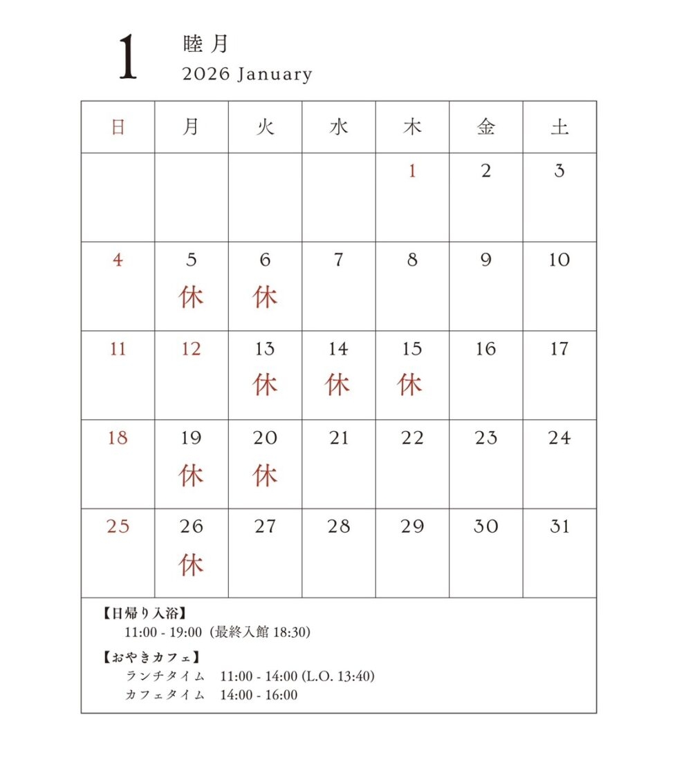 日頃よりやきもち家をご愛顧いただきまして、誠にありがとうございます。 館内メンテナンスの為、下記日程を休館日とさせていただきます。 ◆日程 令和8年 1月5日(月)、6日(火)、13日(火)、14日(水)、15日(木)、19日(月)、20日(火)、26日(月) 皆様には大変ご迷惑をおかけいたしますが、 何卒ご理解とご協力を賜りますようお願い申し上げます。
