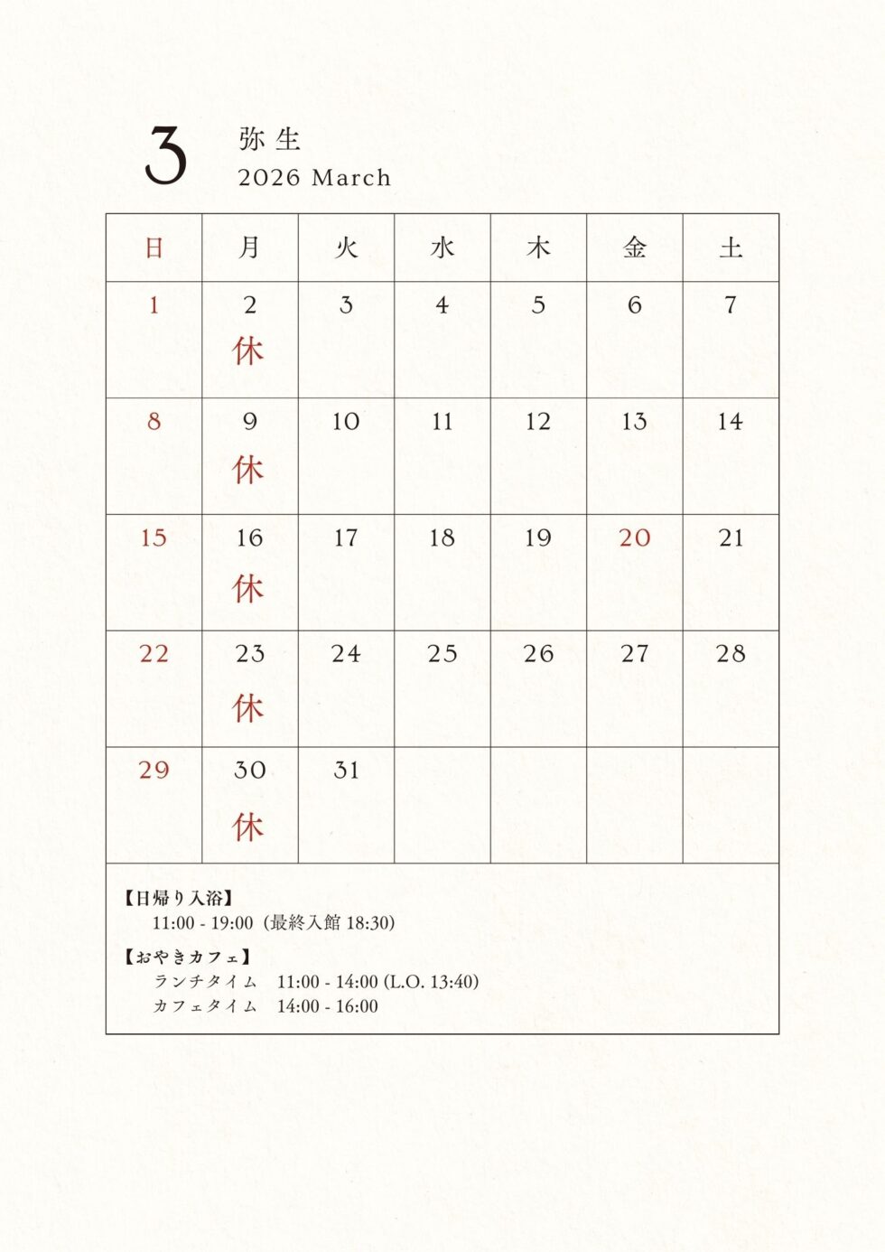 日頃よりやきもち家をご愛顧いただきまして、誠にありがとうございます。 館内メンテナンスの為、下記日程を休館日とさせていただきます。 ◆日程 令和8年 3月2日(月)、9日(月)、16日(月)、23日(月)、30日(月) 皆様には大変ご迷惑をおかけいたしますが、 何卒ご理解とご協力を賜りますようお願い申し上げます。